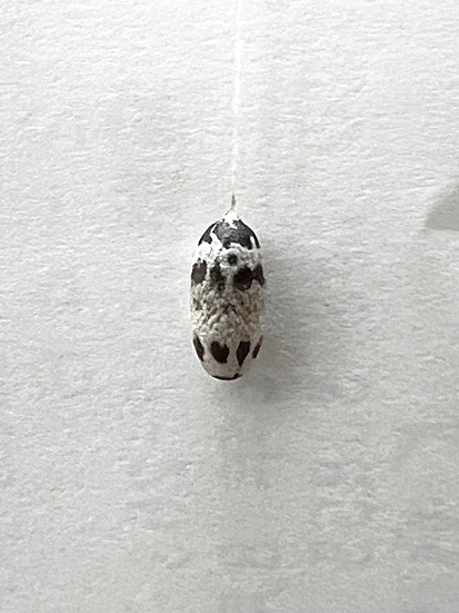 先ずは『繭』、穴が開いていないので、中にはサナギがいると思われます。繭の表面には絹のような光沢があります。形はさておき、このおしゃれな白黒模様はどうやってつくるのかしら?どんな意味があるのでしょう?