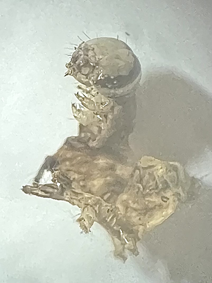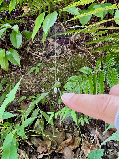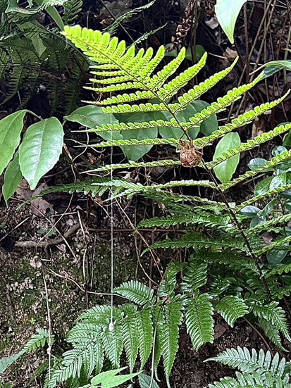 次に『抜け殻』。蛾の幼虫の中に蜂の幼虫がいたはず、イモムシがイモムシに食べられて、空っぽになって干からびたイモムシがあるかもです。糸の付け根から少し離れたシダの葉先にゴミのようなものがありました。「これかなぁ~。」
