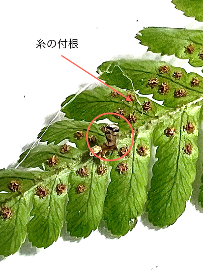 糸の付け根は…葉の裏側なので良く見えません。糸のくっ付いていたシダの葉ごと繭を持って帰ります。