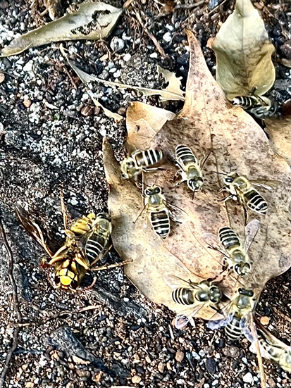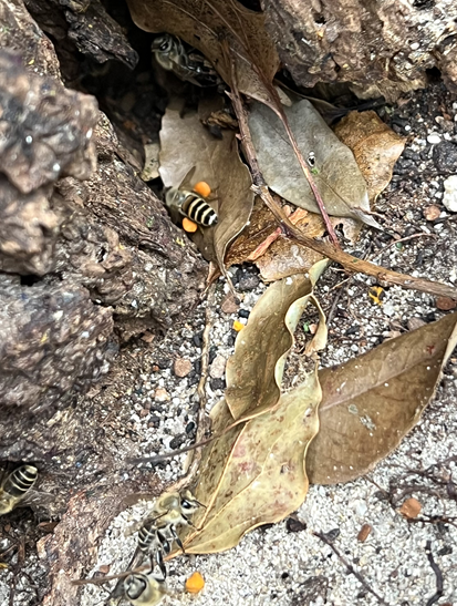 時々キイロスズメバチが様子を伺いに来ますが、ミツバチ達は平常運転で元気に暮らしているようです。巣を出入りする時に襲われないためなのか、蜜や花粉を集めた働きバチは小石を投げ込むように巣に帰ってきます。あまりの勢いに、後ろ脚にたっぷりとくっ付けた大事な花粉を落としてしまうこともあり、あらあら…。