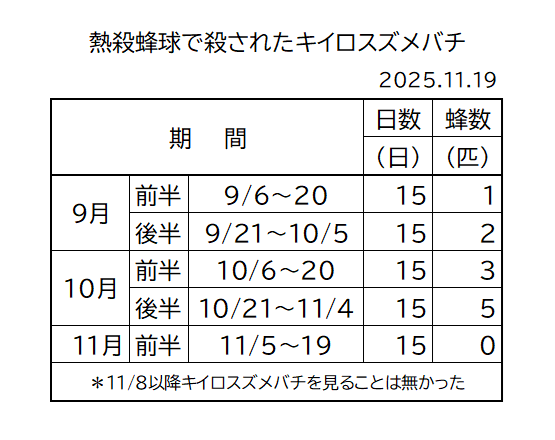 9月前半に15日に1回だったものが、10月前半には5日に1回、10月後半にはなんと3日に1回の割合で熱殺蜂球でスズメバチを撃退しているということになります。秋が深まるにつれてスズメバチの攻勢が激しさを増したようです。